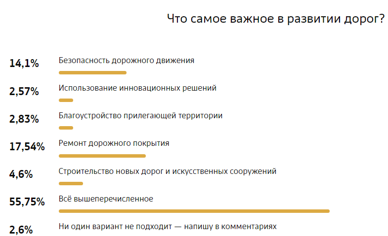 В результате респонденты так расставили приоритеты: использование инновационных решений – 2, 57%; строительство новых дорог и искусственных сооружений – 4,6%; безопасность дорожного движения – 14, 1%; ремонт дорожного покрытия – 17, 54%; всё вышеперечисленное – 55, 75%; ни один вариант не подходит – напишу в комментариях – 2, 6%.