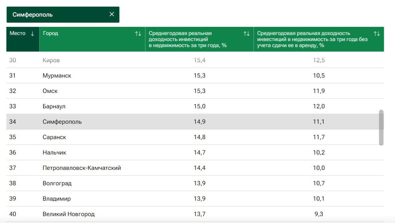 Среди всех крымских городов Симферополь оказался выше в рейтинге доходности вложений в жилую недвижимость - на 34 месте из 100 возможных с показателем в +14,9% за три года. Далее следует Евпатория (67 место рейтинга) с показателем +10%.