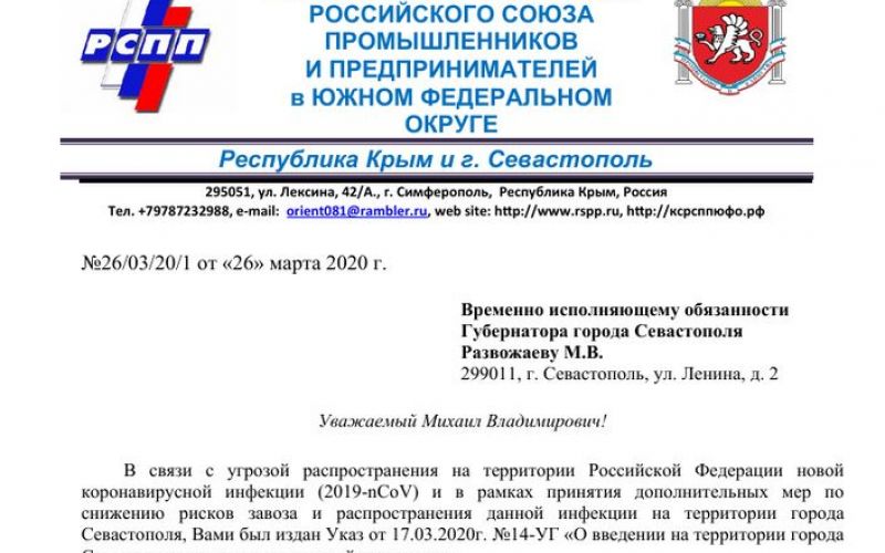 Вице-президент Российского Союза промышленников и предпринимателей Павел Лебедев обратился к губернатору Севастополя Михаилу Развожаеву с просьбой рассмотреть возможность поддержки субъектов малого и среднего предпринимательства в связи с угрозой распространения на территории Российской Федерации новой коронавирусной инфекции (2019-nCoV).