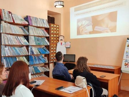 Сотрудники библиотеки подобрали для наших гостей литературу по планированию семьи, репродуктивному здоровью, показали видеоролик «Учимся планировать».