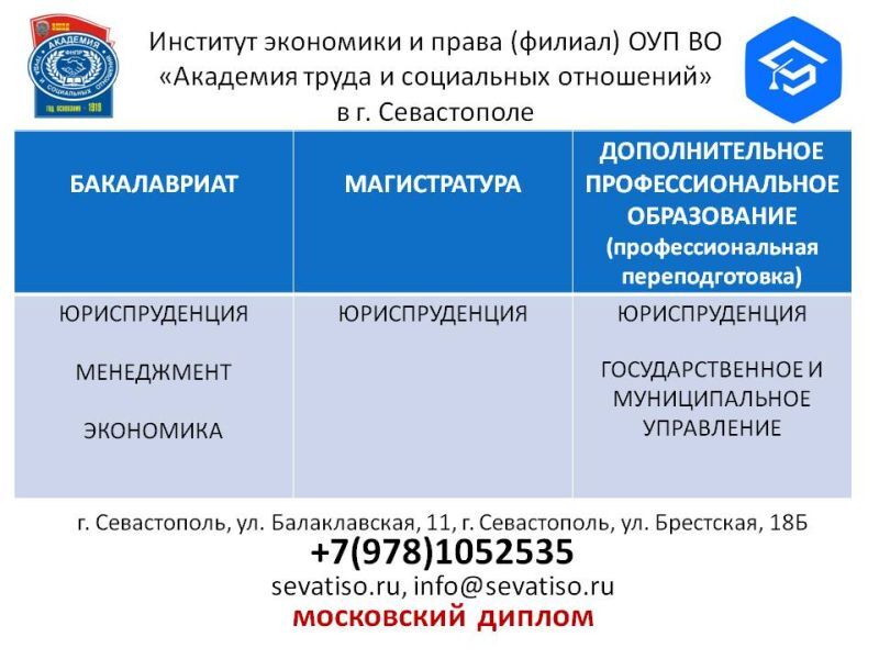 Институт экономики и права (филиал) образовательного учреждения профсоюзов высшего образования «Академия труда и социальных отношений» в городе Севастополе получил лицензию на осуществление образовательной деятельности по реализации образовательной программы магистратуры по направлению подготовки юриспруденция.
