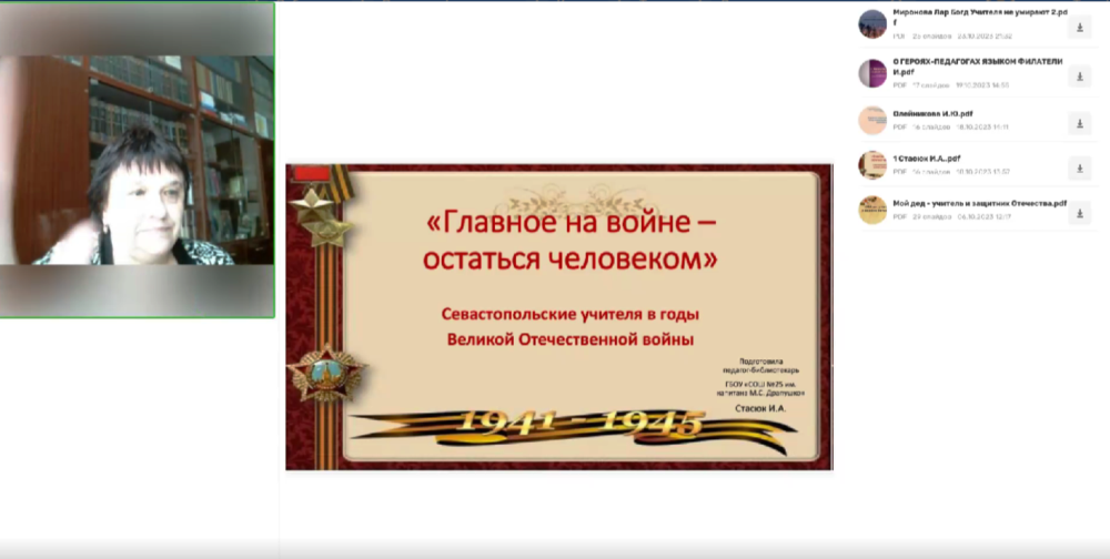 Стасюк Ирина Анатольевна, педагог-библиотекарь СОШ № 25, рассказала о нескольких учителях города Севастополя, сражавшихся с немецко-фашистскими захватчиками в своем выступлении «Главное на войне – остаться человеком». Задача не из лёгких, когда вокруг ужас, голод и разруха. Но они – севастопольские учителя, «инженеры человеческих душ», с достоинством выполнили этот завет. Педагоги не просто сами сохранили человечность, но и взрастили это качество в тысячах маленьких севастопольцев, которых, несмотря на возраст, война не пожалела. Они работали во время обороны в оккупированном городе, а после – восстанавливали систему образования в разрушенном до основания Севастополе.