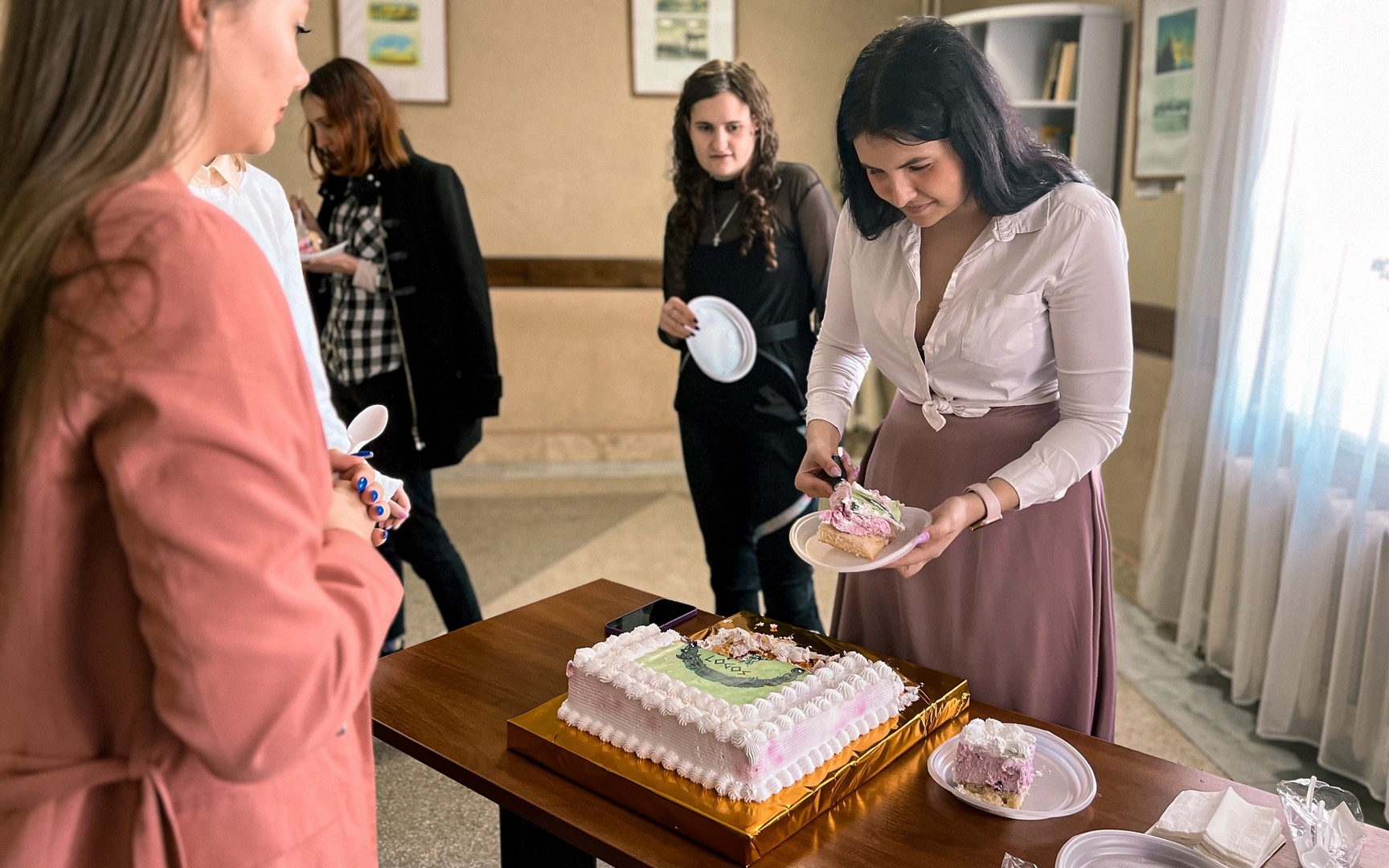 Члены Президиума, участники клуба и приглашенные гости 6-го марта отпраздновали это событие. В холле 2 этажа главного учебного корпуса состоялись видеосеанс с поздравлениями от членов Президиума, конкурсная программа для участников и гостей. Приятным завершением вечера стал подарок от Студенческого профсоюза – праздничный торт.
