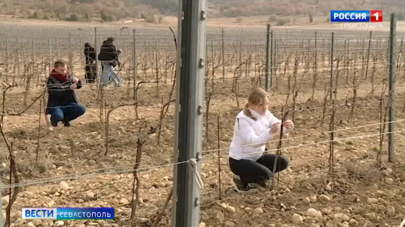 На севастопольских виноградниках приступили к подвязке лозы. Опытным виноградарям помогают студенты.