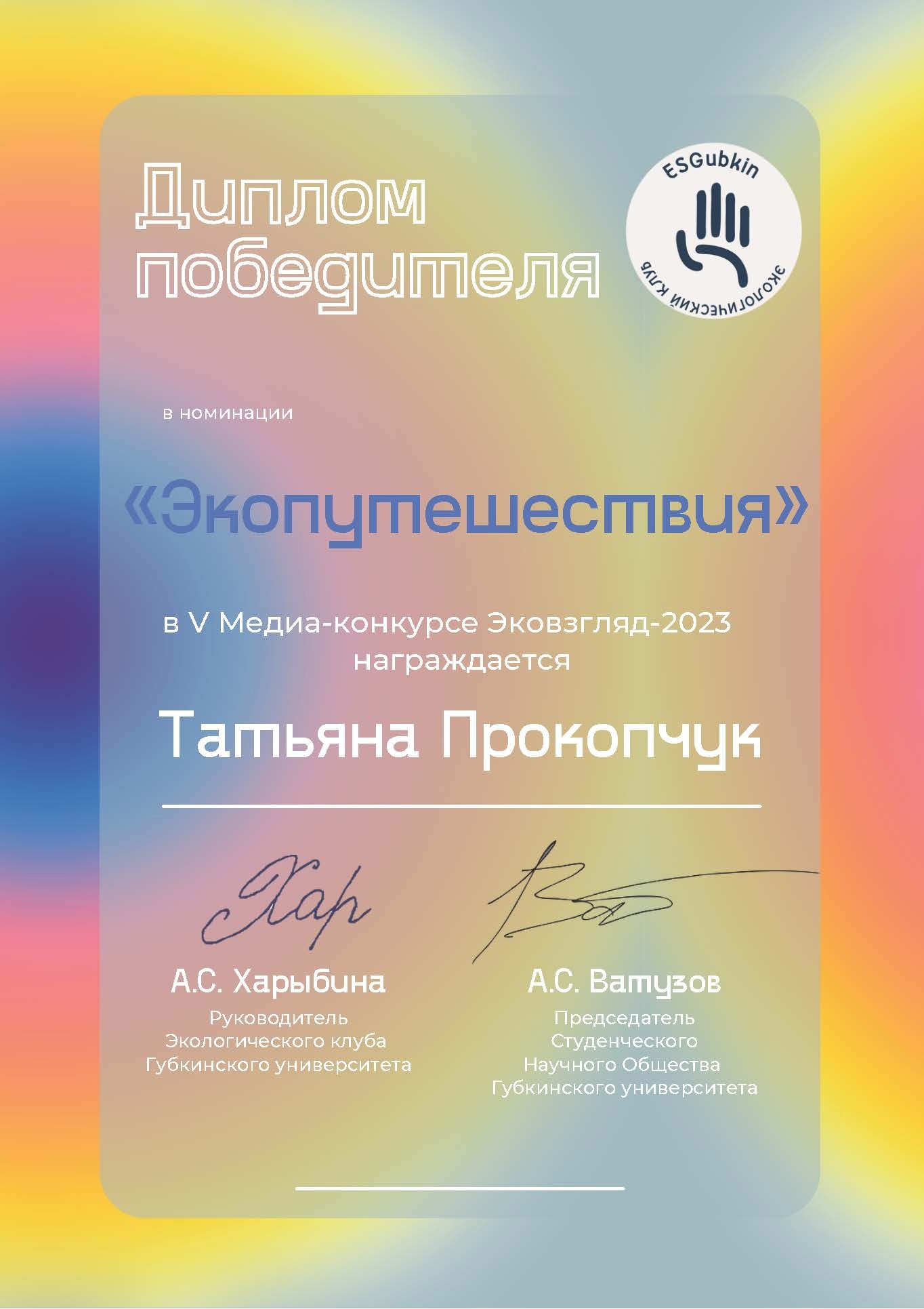 Выпускница Севастопольского филиала РЭУ им. Г.В. Плеханова Татьяна Прокопчук стала победителем V Медиа-конкурса «Эковзгляд-2023» в номинации «Экопутешествия».