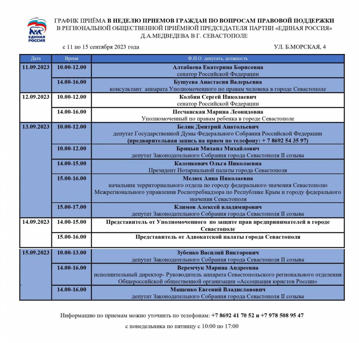 Приемы проведут сенаторы РФ, депутаты Государственной Думы и Законодательного Собрания от «Единой России», представители Аппарата уполномоченного по правам человека в Севастополе, нотариальной палаты и территориального отдела Межрегионального управления Роспотребнадзора.