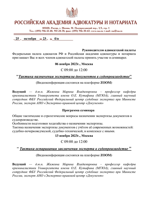 Федеральная палата адвокатов РФ и Российская академия адвокатуры и нотариата приглашает Вас принять участие в семинаре 13 ноября 2023 г., с 9:00 до 12:00 на тему: " Тактика оспаривания заключения эксперта в судопроизводстве "