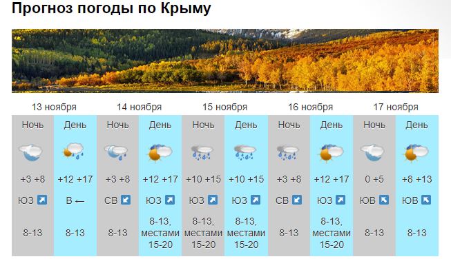 Ветер ночью юго-западный, днем восточный 8-13 метров в секунду. Температура воздуха ночью 3…8°, на побережье до 12°; днем 12…17°, в горах 6…11°.