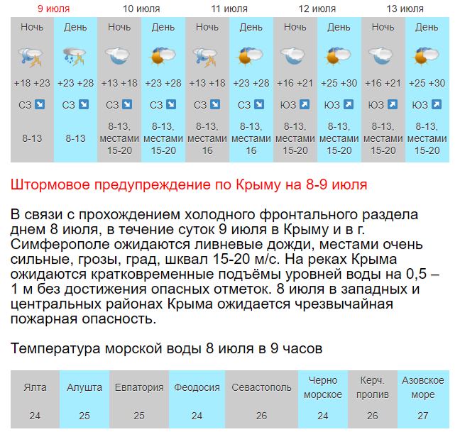 В воскресенье холодный фронтальный раздел вызовет на полуострове ливневые дожди, местами очень сильные, грозы, шквал 15-20 м/с, вероятен град.