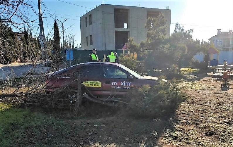 Случился инцидент 24 января на набережной Андрея Первозванного. По предоставленным фотографиям видно, что водитель одного из городских такси заехал прямо в сквер практически вплотную к детской площадке. При этом пострадали два дерева: лох серебристый снесён полностью, а от краснокнижной сосны крымской остался ствол примерно в полметра.