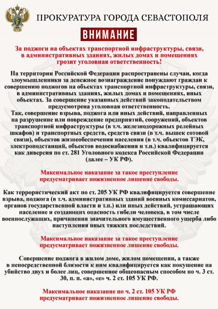 Прокуратура города Севастополя разъясняет об уголовной ответственности, грозящей за поджоги на объектах транспортной инфраструктуры, связи, в административных зданиях, жилых домах и помещениях.