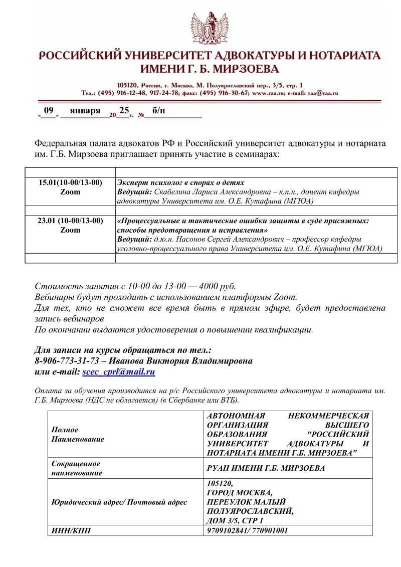 Семинар для адвокатов 15 января 2025 года