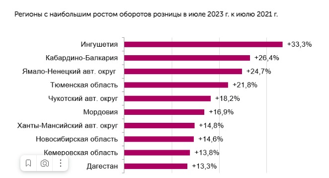 Наибольшее увеличение оборота розницы произошло в Ингушетии (на 33,3% в июле 2023 года к июлю 2021 года с учетом инфляции), Кабардино-Балкарии (+26,4%), Ямало-Ненецком автономном округе (+24,7%), Тюменской области (+21,8%), Чукотском автономном округе (+18,2%), Мордовии (+16,9%), Ханты-Мансийском автономном округе (+14,8%), Новосибирской области (+14,6%), Кемеровской области (+13,8%) и Дагестане (+13,3%). В регионах с высоким ростом розницы увеличение доходов населения было сильнее, чем в среднем по стране.