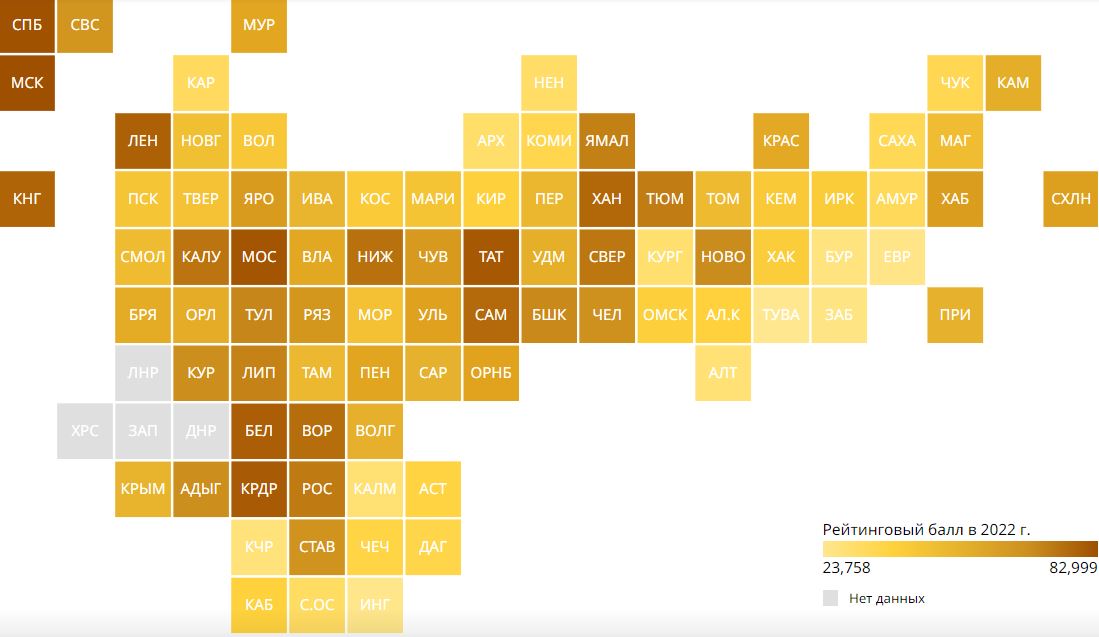 Согласно исследованию, сводный рейтинговый балл вырос за год у всех регионов за исключением Чукотки , где зафиксировано незначительное снижение (минус 0,1 пункта). Медианное значение рейтингового балла всех регионов РФ выросло с 48,1 (в 2021 году) до 51 (в 2022), а среднее значение – с 48,3 до 51,3.