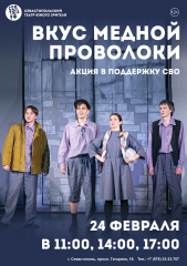 ТРИ ПОКАЗА спектакля «ВКУС МЕДНОЙ ПРОВОЛОКИ» в рамках сбора средств в поддержку СВО проведёт Севастопольский ТЮЗ 24 февраля в 11:00, 14:00 и 17:00.
