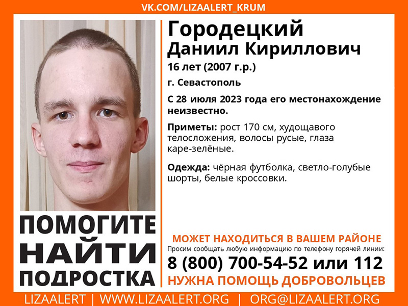 В Севастополе пропал 16-летний Даниил Кириллович Городецкий (2007 г.р.). С 28 июля 2023 года его местонахождение неизвестно. К поиску подключились волонтёры поисково-спасательного отряда «Liza Alert Крым».