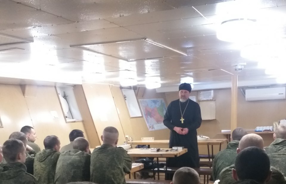 В понедельник 20 февраля помощник командира соединения кораблей ЧФ протоиерей Александр Бондаренко провел беседу с военнослужащими роты охраны.