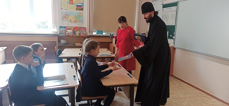 Отец Николай привёз в подарок школе и учащимся детские Библии. В течение урока ребята, совместно с учителем и батюшкой, читали Библию и разбирали вопросы по теме конкурса. По окончании встречи дети и педагог поблагодарили отца Николая за помощь и участие.