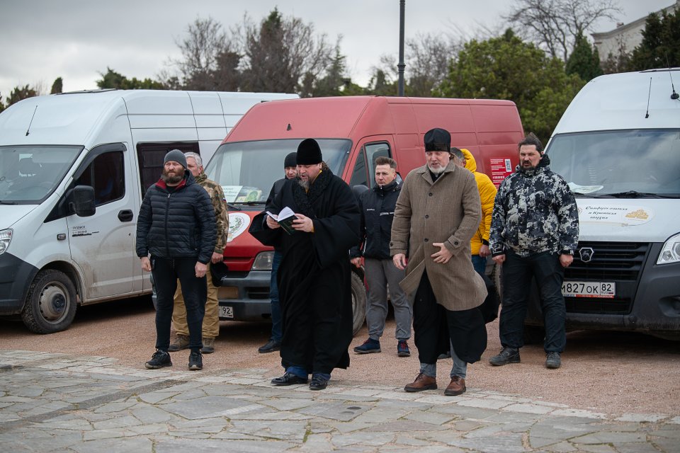 Накануне отбытия, 6 февраля, благочинный Севастопольского церковного округа протоиерей Сергий Халюта отслужил молебен с призыванием помощи Божией на всякое благое дело, после чего помощник благочинного по работе с правоохранительными органами протоиерей Алексий Петренко окропил участников гуманитарной миссии и микроавтобусы колонны святой водой.