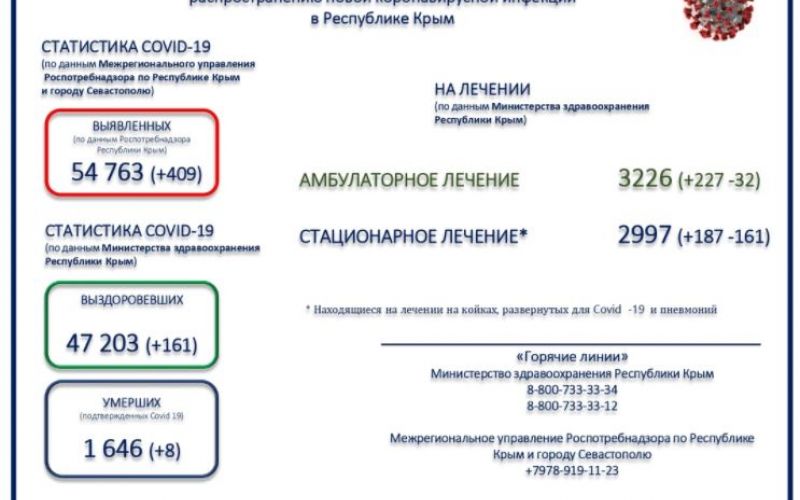Всего в Крыму коронавирус подтвержден у 54 763 человек. Выздоровевших за весь период 47 203 человека, скончались 1 646 человек.