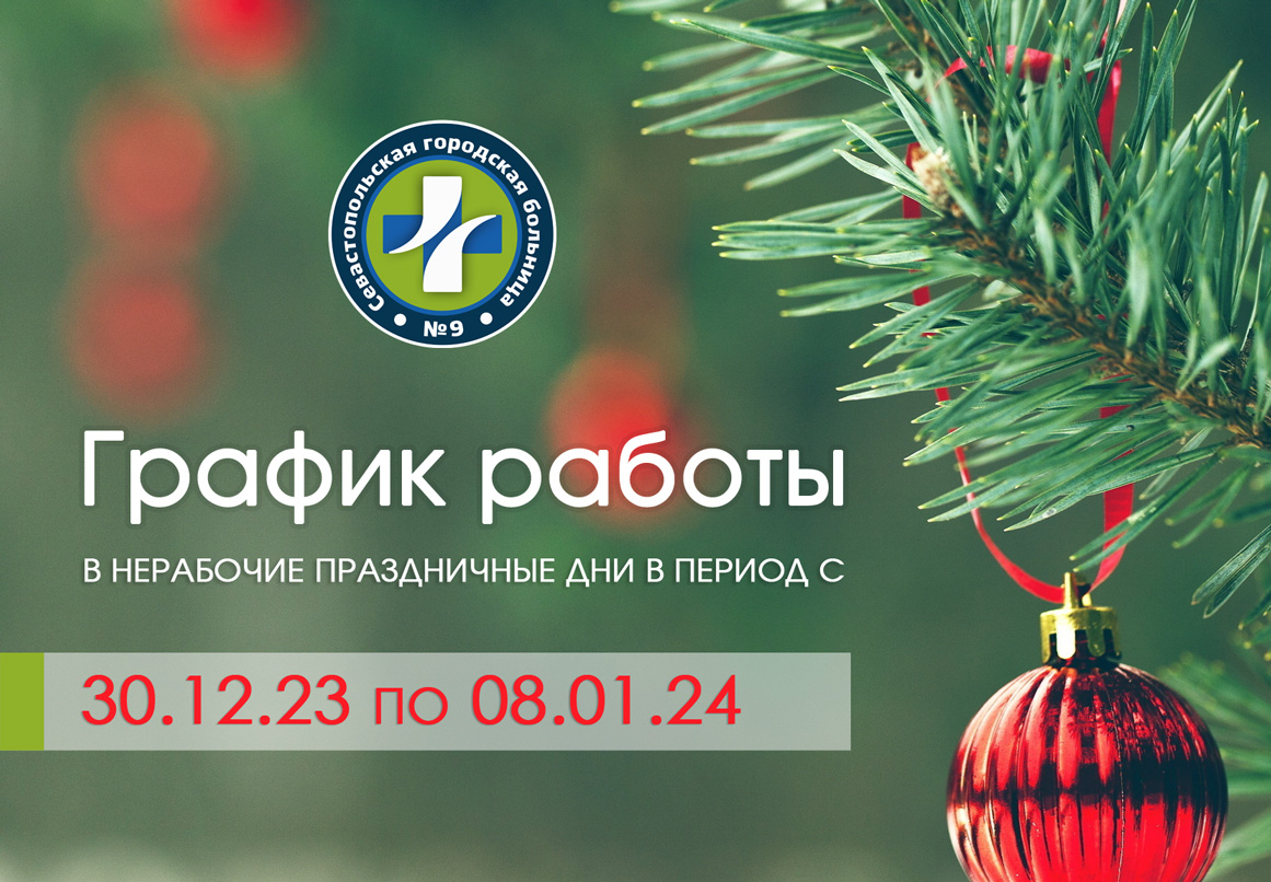 ГРАФИК РАБОТЫ В НЕРАБОЧИЕ ПРАЗДНИЧНЫЕ ДНИ с 30.12.2023 по 08.01.2024 Взрослая и детская поликлиники городской больницы № 9 в Балаклаве: • 31 декабря, 1, 7 и 8 января – не рабочие дни; • 30 декабря,