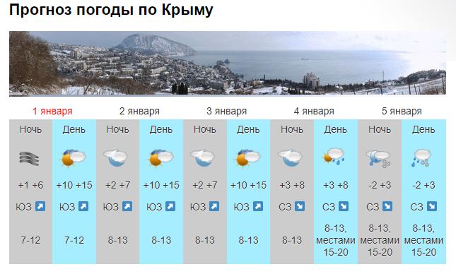 По информации крымского гидрометцентра, 1-3 января на полуострове будет сухо и тепло. В ночные и утренние часы вероятны туманы. Ветер юго-западный 8-13 м/с. Температура воздуха ночью +2…+7°, на побережье до +10°, днем +10…+15°, в горах +4…+9°.