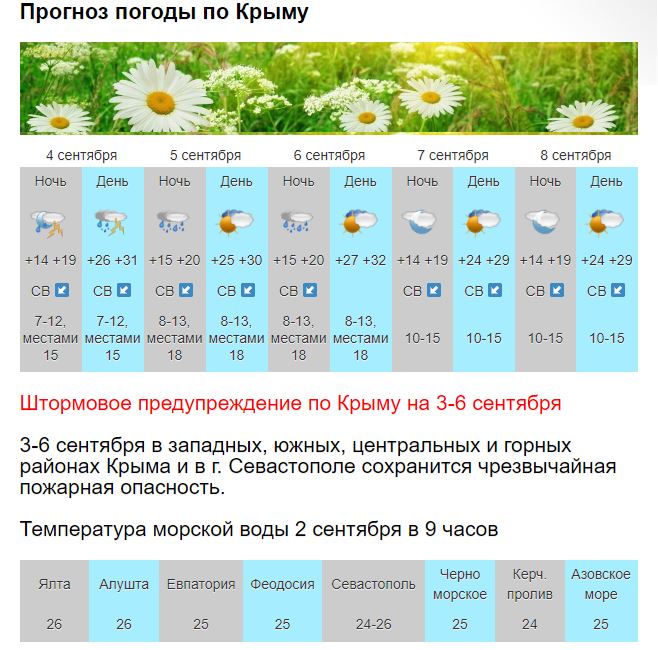 "В понедельник на синоптической карте Крыма появится циклоническая депрессия. Ночью переменная облачность и без осадков, температура +15…20 градусов. А в дневные часы появятся кучево-дождевые облака, местами кратковременный дождь и гроза. Но температура при этом не изменится, ожидается +26…31 градус, что существенно выше нормы. Она для начала сентября составляет 25 градусов ", - рассказал в эфире радио " Спутник в Крыму " ведущий специалист центра погоды "Фобос" Евгений Тишковец..