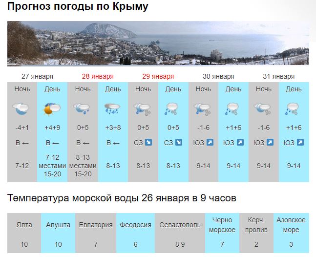 В выходные дни, 28-29 января, южный циклон вызовет на полуострове осадки, местами сильные: в субботу - в виде дождя; в воскресенье - в виде мокрого снега, в горах снега.